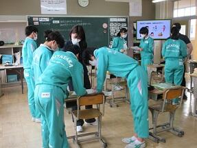 朝、学級の係活動で職員室へ来る生徒に、できるだけ声をかけるようにしています。そんな中、昨日、今日と1年生の女子でとても気持ちのよいあいさつができる生徒を見つけました。生徒のよいところが見つかった朝は、とても気持ちよく1日がスタートできます。ありがとう。