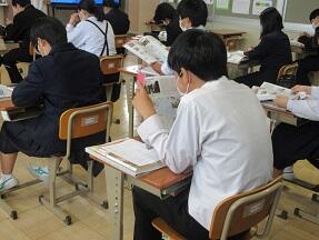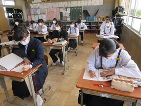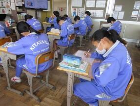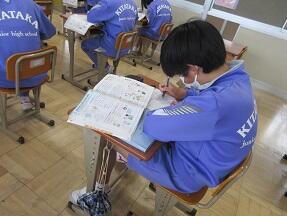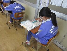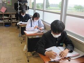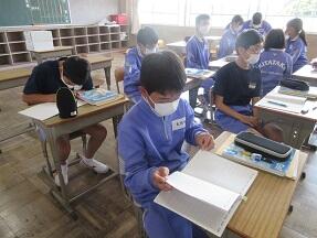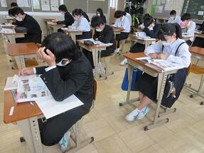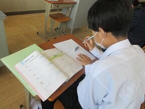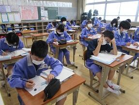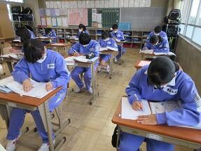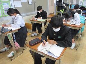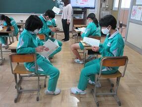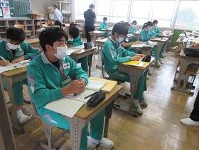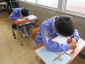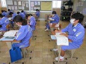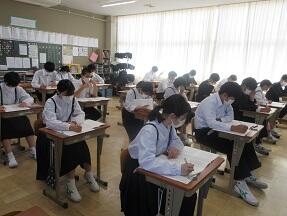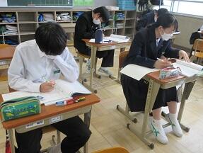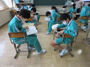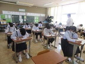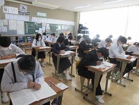 今日、3年生は1校時から5校時まで実力テストを実施しています。今後の高校入試の志望校決定の資料になります。みんな真剣に取り組んでいました。
