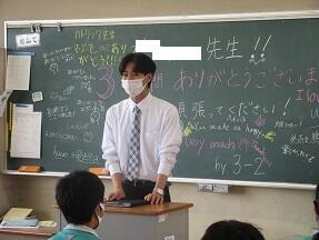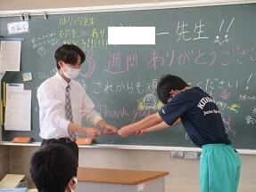 5月9日から教育実習に来ていた2名の学生が、昨日で無事実習を終了しました。2人ともとても真摯に生徒たちと向き合い生徒たちによい影響を与えてくれたと感じています。最後は所属したクラスで生徒たちが用意した色紙を受け取りあいさつをし写真撮影をしていました。2人とも、ぜひ教員になってほしいと感じさせる学生でした。
