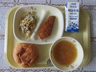 今日の給食は、かみかみメニューで、セルフフィッシュバーガー(丸型牛乳パン・白身魚フライ)、ごぼうサラダ、牛乳、オニオンスープです。高根沢町で生産されたものは、にんじん、玉ねぎ、きゅうりです。今日もたいへんおいしく頂きました。