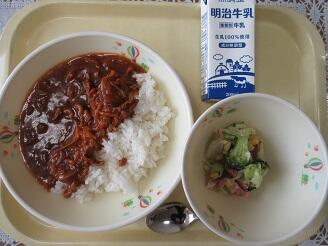 今日の給食は、ご飯、牛乳、ハッシュドポーク、サラミとブロッコリーのサラダです。高根沢町で生産されたものは、玉ねぎ、キャベツ、米です。今日もたいへんおいしく頂きました。