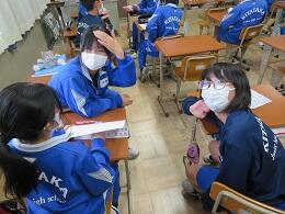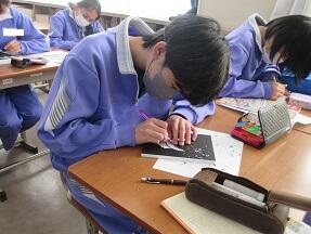 ブックカバーづくりで、終わった生徒からふりかえりを行っていました。よい作品が仕上がっているようでした。