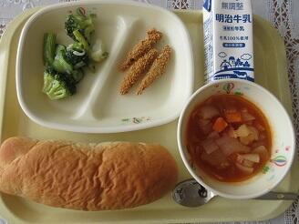 今日の給食は、かみかみメニューで牛乳パン、牛乳、きびなごフライ、グリーンサラダ、ミネストローネです。高根沢町で生産されたものは、にんじん、大根、ブロッコリーです。今日もたいへんおいしく頂きました。