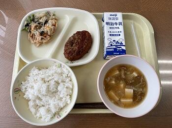 麦ごはん ハンバーグ 切り干し大根とツナの和え物 なめこ汁