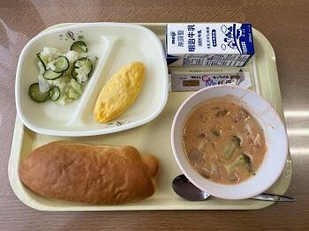 牛乳パン キャラメルクリーム オムレツ グリーンサラダ トマトクリームシチュー