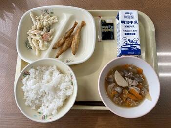 ごはん ワカサギのフリッター マカロニサラダ(チーズ) 豚汁 のり佃煮