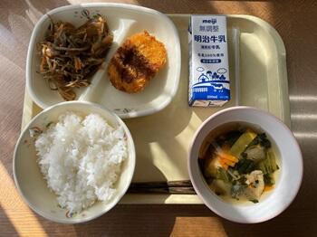 ごはん 野菜コロッケ きんぴら 生姜仕立てスープ