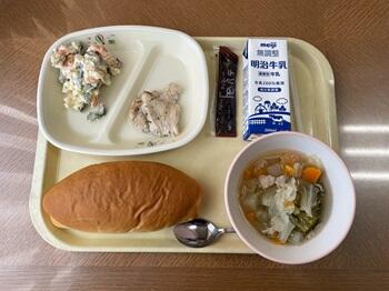 牛乳パン チョコクリーム 鶏肉のハーブ焼き サツマイモのサラダ ポトフ