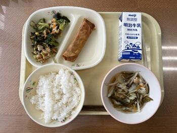 ごはん 春巻き バンバンジーサラダ 茎わかめの中華スープ