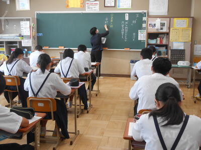 【授業参観】3年1組「国語」教育実習生も授業になれてきました。掲示物を作成し、生徒がわかりやすいように工夫しています。