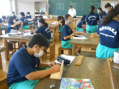 1年3組「技術」のこぎりを使って板を切っていました。なかなか上手に切るのは難しいようです。やはり筋力(腕力)が必要ですね。