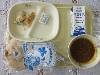 今日の給食は、ナン、牛乳、キーマカレー、ごまポテサラダ、チーズです。高根沢町で生産されたものは、玉ねぎです。今日もたいへんおいしく頂きました。
