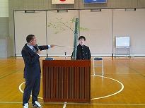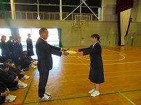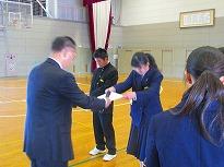 ●最初に、表彰。バレー部が地区協会長杯で「第3位」になった賞状を授与しました。