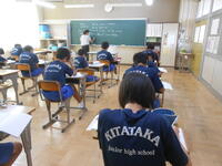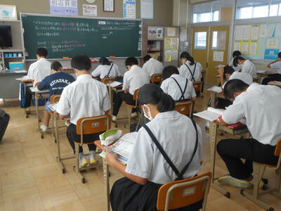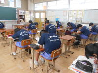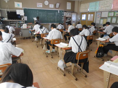 3年1組「実力テスト」3年生は高校入試に向けて、5教科の復習テストを実施しています。1・2年生で学習した内容も出題されるので、日頃の学習の成果が表れます。