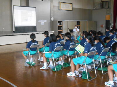 【1年生総合的な学習の時間】テーマは「環境」です。その一環として「足尾銅山鉱毒事件」により環境が壊された足尾を緑にしようという取り組みに参加しています。本校の特色ある取り組みの一つで、本日は足尾(日光市)から講師を招き、講話をいただきました。10月2日、実際に足尾に植樹に行きます。