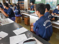 1年3組「技術」木材加工です。それぞれ板に線を引き、のこぎりで加工しています。何ができるか楽しみです。