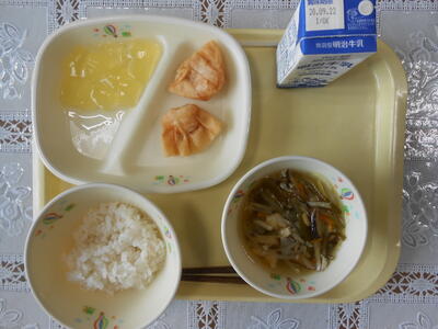 【給食メニュー】麦ご飯、揚げえび餃子、茎わかめの中華スープ、ゼリーです。揚げえび餃子がカリカリして具も厚く、とても美味しかったです。ごちそうさまでした。