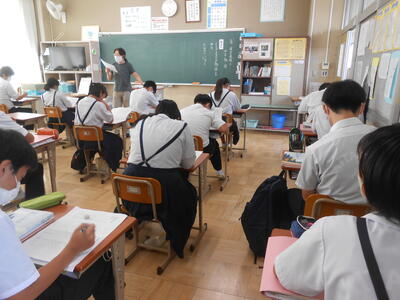 1年3組「音楽」ソーシャルディスタンスに配慮しながら、合唱をしていました。10月末に「校内合唱コンクール」を開催する予定ですが、今の段階で全員で一緒に練習することはできません。果たして、当日までどのような状況で練習ができるか不安です。