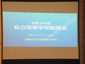 本日の午後、県内私立高等学校7校を招いて、私立高等学校説明会を実施しました。悪天候の中、保護者の皆様方にはお集まり頂き、たいへんありがとうございました。これまでも家庭において進路のことは話し合われていたと思いますが、さらに具体的な話合いにするためのよいきっかけになったと思います。