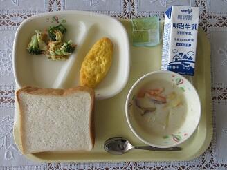 今日の給食は、食パン、アップルジャム、牛乳、オムレツ、フレンチサラダ、さつま芋のシチューです。高根沢町で生産されたものは、玉ねぎ、さつまいもです。今日もたいへんおいしく頂きました。