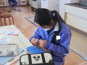 ブックカバーづくりで、終わった生徒からふりかえりを行っていました。よい作品が仕上がっているようでした。