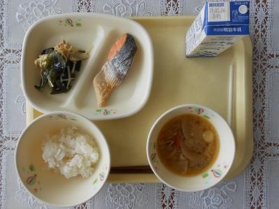 【給食メニュー】 豚汁、焼き鮭、エノキとわかめのツナ和えです。焼き鮭には骨がなく、丸ごと食べられました。完食です。