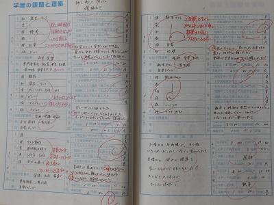 【計画】 学習成績の良い生徒の「生活の記録」です。帰りの会で家庭学習の計画と反省を記入しています。