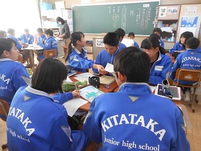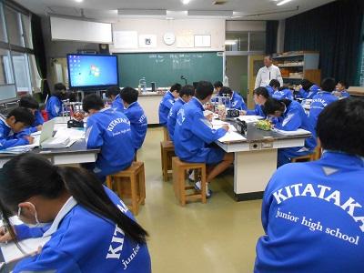 【授業研究】町教委から3名の先生方が来校し、2年2組の「理科」の授業を行いました。雲の発生の仕方を実験や映像を交えて、理解していました。キーワード、上昇気流・気圧・膨張・露点等を使って、言葉で説明していました。