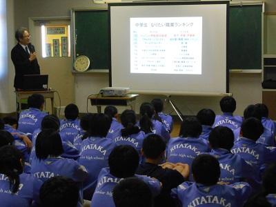【キャリア教育】2年生は講師を招いて、「キャリア教育」の一環として、将来の職業に就くために必要な資格や進学先等について学びました。最近の男子中学生の第1希望の職業はYouTuberだそうです。びっくりです。