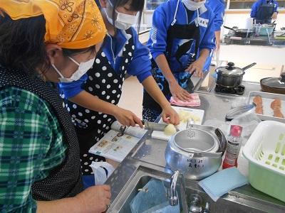 【授業参観】1年1組「家庭」調理実習です。ボランティアの方(2名)が協力していただき、スムーズに料理が完成しました。