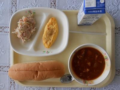 【給食メニュー】ツナサンド、トマトオムレツ、ブラウンシチューです。シチューは濃厚でとてもおいしくいただきました。