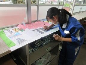 放課後美術部の活動を見に行くと、以前お知らせした国体の応援のぼり旗の彩色している3年生女子がいました。聞くと終わらなかったところを先生に許可を取って自主的にやっているとのことでした。素晴らし5名の3年生女子です。