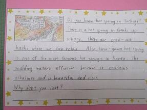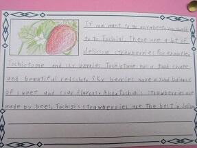 期末テストのふりかえりをやっていました。こちらも廊下に以前英語の授業でやっていた、栃木県の観光大使になったつもりで書いた紹介文が掲示されていたので紹介します。
