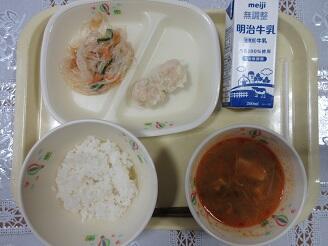 今日の給食は、ご飯、牛乳、えび焼売、中華くらげ和え、キムチスープです。高根沢町で生産されたものは、豆腐、味噌、にんじん、玉ねぎ、ねぎ、米です。今日もたいへんおいしく頂きました。