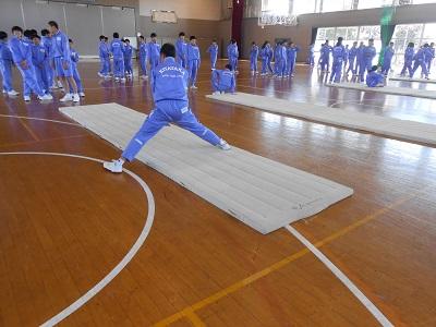 【授業の様子】 1年生が保健体育の授業で「マット運動」を行っていました。次の時間に発表会を行うため、各自が連続技を練習していました。