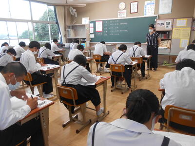 【テストの様子】すべてのクラスで密閉を避け、ソーシャルディスタンスに配慮して取り組んでいました。1時間目はすべての学年で国語のテストを実施していました。特に漢字の読み書きでは、正解の生徒が多く、BT(ベーシックタイム)の漢字テストの成果が表れていました。