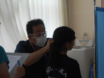 【耳鼻科検診】花粉症などアレルギーのある生徒が増えているとのことです。(検診は薄暗い環境で行うため、写りが良くないので御了承ください。)