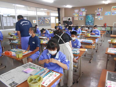 2年1組「美術」ポースターの作製でポスターカラーの絵の具を使って丁寧に塗っていました。