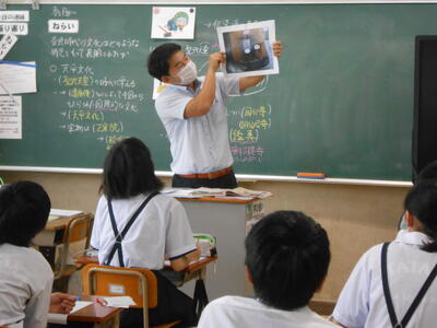 1年1組「社会」奈良時代の文化の特徴について学んでいました。授業者は教育実習生です。残り1週間となりました。