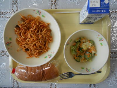 【給食メニュー】牛乳パン、トマトソース(ナスとひき肉)スパゲティ、シーザーサラダです。スパゲティをパンに挟んで食べました。