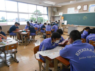 【修学旅行事前学習】3年生はテスト終了後の6時間目に「修学旅行事前調査」を行っていました。グループに分かれ2日目の班別行動のコースを楽しそうに決めていました。清水寺・金閣寺・東寺・・・・・どこに行くのでしょうか。
