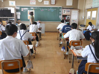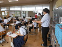 【テストの様子】すべてのクラスで密閉を避け、ソーシャルディスタンスに配慮して取り組んでいました。1時間目はすべての学年で国語のテストを実施していました。特に漢字の読み書きでは、正解の生徒が多く、BT(ベーシックタイム)の漢字テストの成果が表れていました。