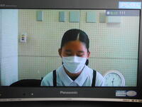 給食は前向きで一人で食べています。今日は校内放送で「自転車の決まり」について映像で確認しました。