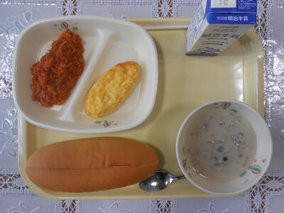 【給食メニュー】コッペパン、牛乳、オムレツ、スラッピージョー、きのこの豆腐スープです。スラッピージョーはひき肉と玉ねぎをよく炒め、ケチャップとソースで味付けをしたもので、パンに挟んだり、麺にかけたりして食べるそうです。とても味が濃厚でパンに挟んで美味しくいただきました。ごちそうさまでした。