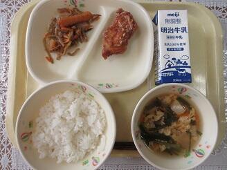 今日の給食は、阿中1年4組の考えた献立で、ご飯、牛乳、鶏のから揚げ、ごぼうのきんぴら、干ぴょう入りかき卵汁です。高根沢町で生産されたものは、にんじん、米です。今日もたいへんおいしく頂きました。