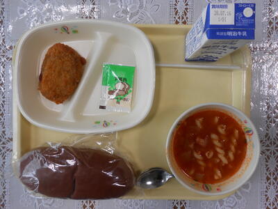 【給食メニュー】カレーコロッケ、黒糖パン、ミネストローネです。黒糖パンにカレーコロッケを挟んで、コロッケパンで食べてみました。とても美味しかったです。