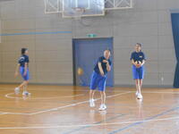 女子は体育館で「バレーボール」の対人パスの練習です。パスを長く続かせるのが難しいです。