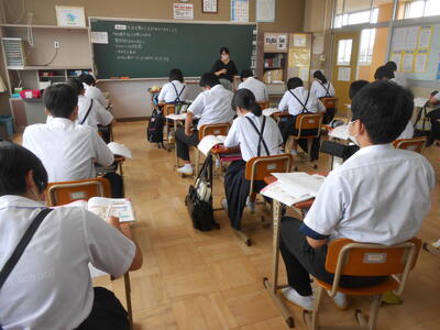 【授業参観】3年1組「国語」教育実習生も授業になれてきました。掲示物を作成し、生徒がわかりやすいように工夫しています。