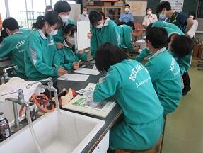 衣類の手入れ方法について学習し、自分の制服やワイシャツなどで確認していました。