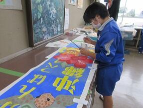 放課後美術部の活動を見に行くと、以前お知らせした国体の応援のぼり旗の彩色している3年生女子がいました。聞くと終わらなかったところを先生に許可を取って自主的にやっているとのことでした。素晴らし5名の3年生女子です。